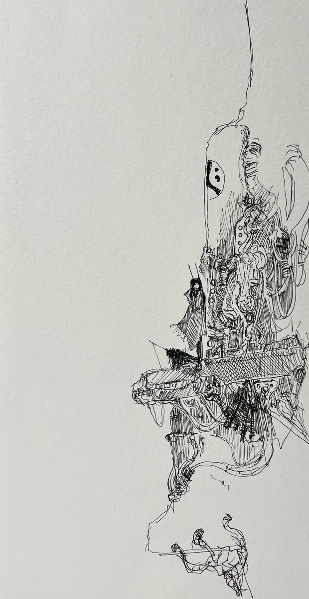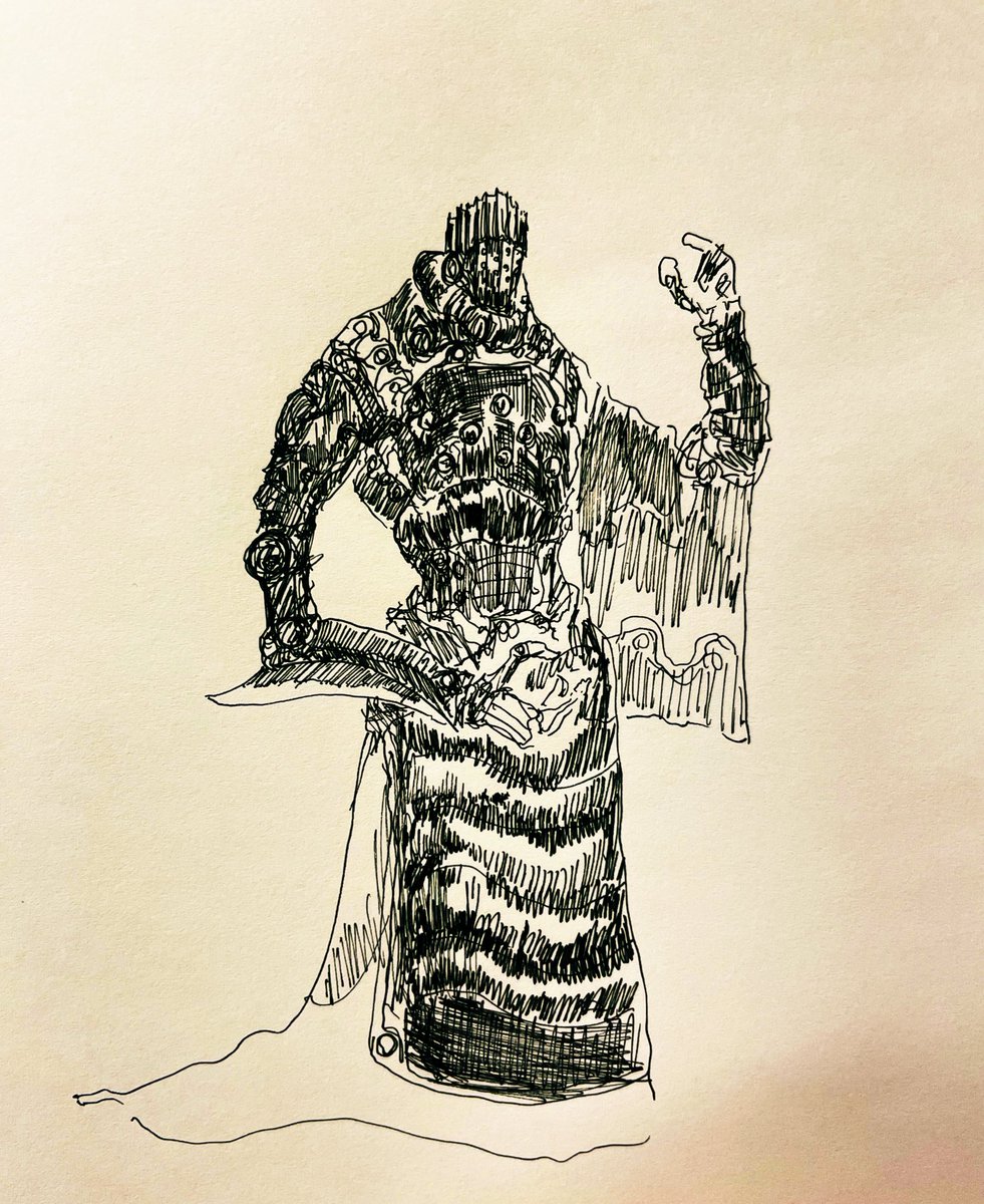 #illustlation #イラスト #タライコン 灯火番 忌まわしき高原戦争の遺物。歪んだ祝福のもたらした、異形兵の一例。 頭に据え付けられた灯火は眩い毒の光であり、長く目にしていると狂って死ぬだろう。
