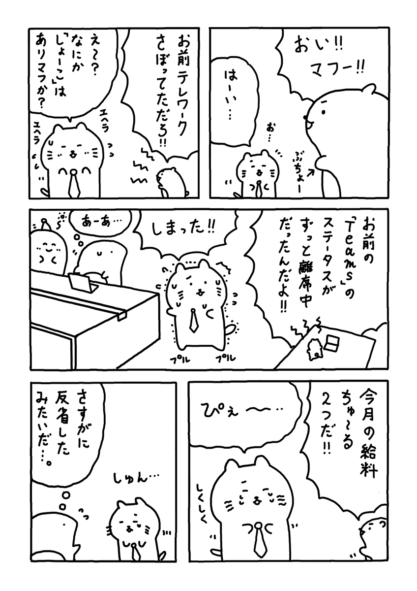 2 9 Teamsはコミュニケーションツールのこと。 在席中・会議中・離席中などが分かる。 一定時間マウスを動かさないと、 自動で「離席中」になってしまうらしい。 #Web漫画 #漫画が読めるハッシュタグ #日常漫画 #ゆるいイラスト #エッセイ漫画 #社内ニート 23/03/05 11:30