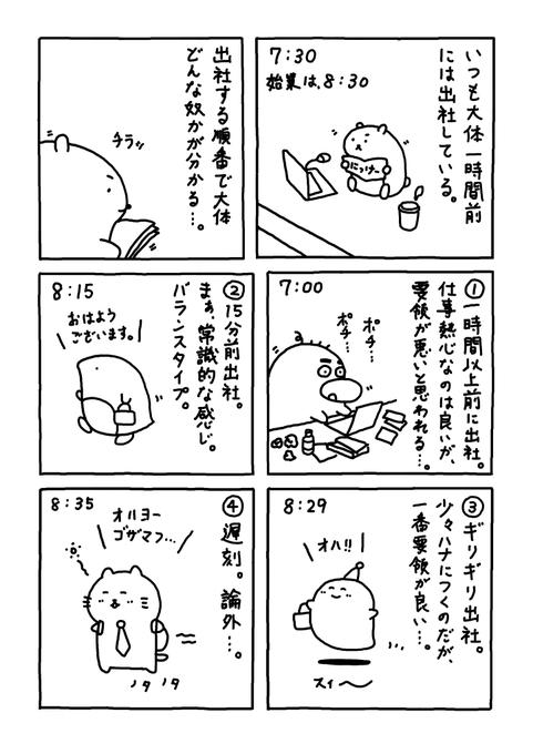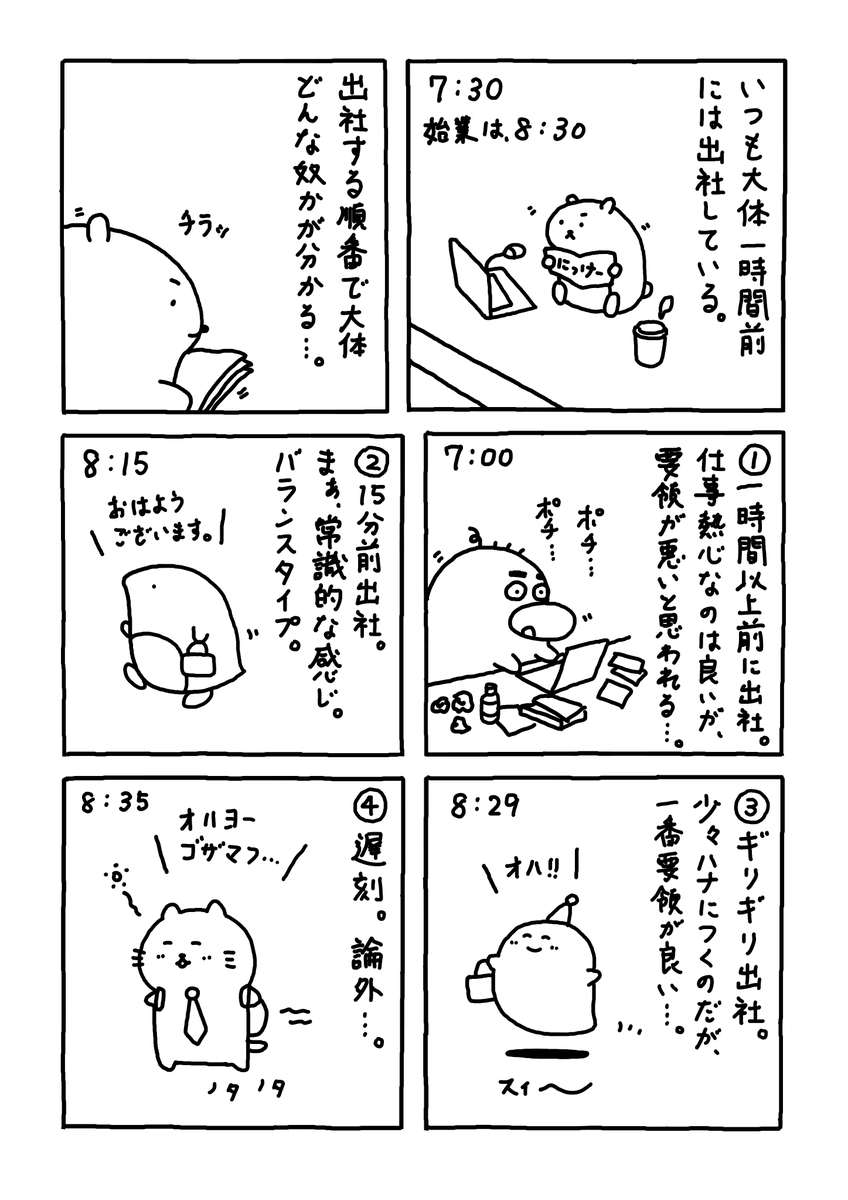 1 4 出社する順番で 人となりが分かりマフ。。 #Web漫画 #漫画が読めるハッシュタグ #日常漫画 #ゆるいイラスト #エッセイ漫画 #社内ニート 23/03/23 11:30