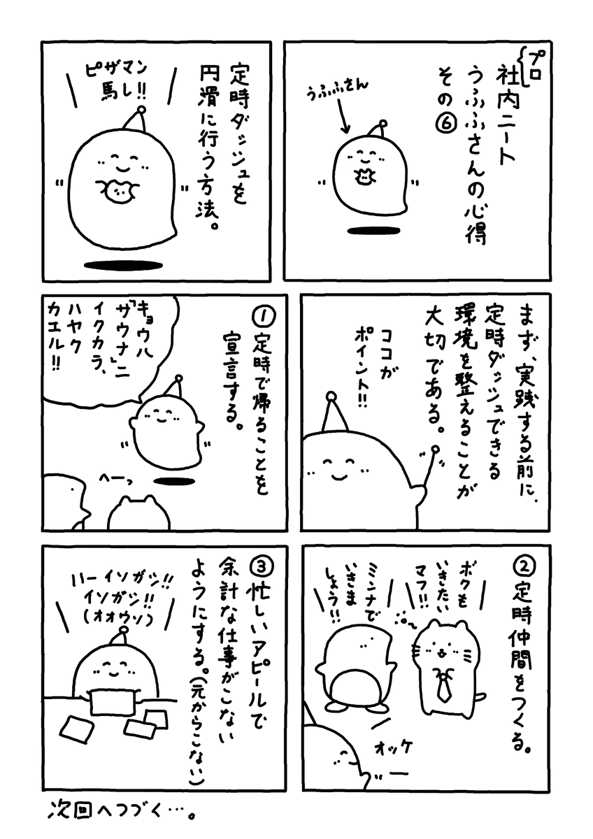 1 11 定時ダッシュを 円滑に行う方法。 #Web漫画 #漫画が読めるハッシュタグ #日常漫画 #ゆるいイラスト #エッセイ漫画 #社内ニート 23/03/20 11:30