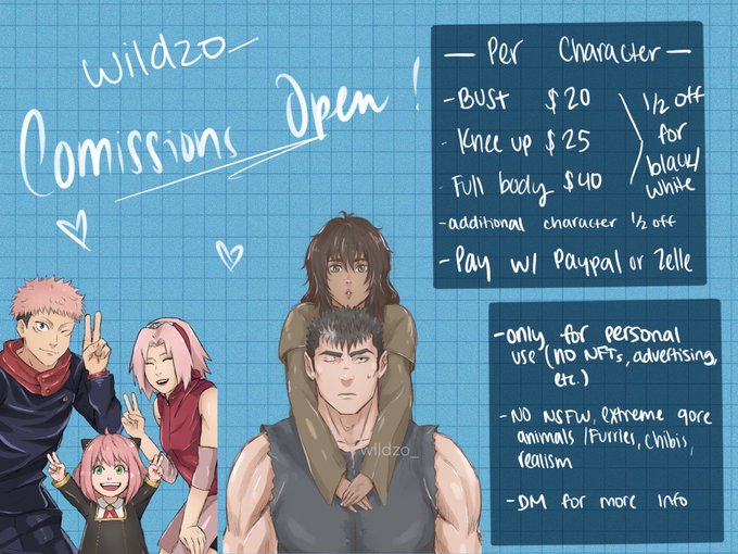 hi bbs! After 3 long years I’m finally opening up commissions! I’ve provided prices and examples at the bottom! More info in the comments :) #artist #ArtistOnTwitter #commissionsopen #Commission #anime #fanart