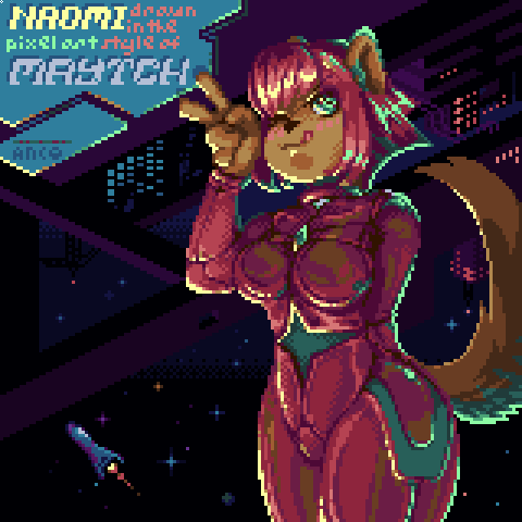 It took a while to get it done but I finally drew my OC Naomi in @Maytch's #pixelart style! Loved the rim lighting and sharp highlight contrast design, although I am not sure I did it justice~ The background was fun, too! 160px.sq. at 3xzoom; 26c. Source: twitter.com/Maytch/status/…