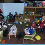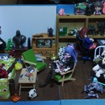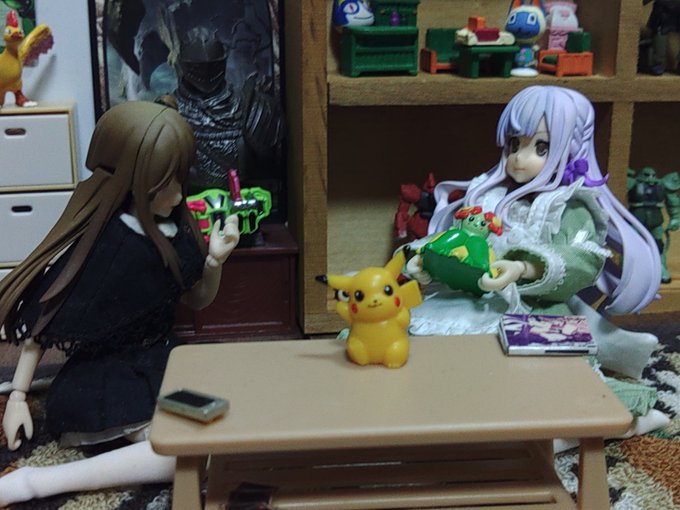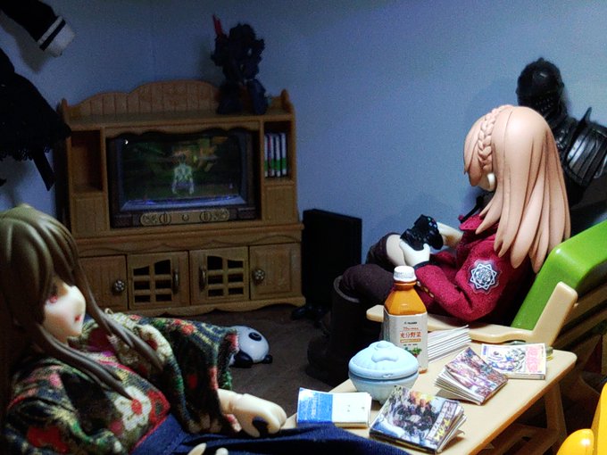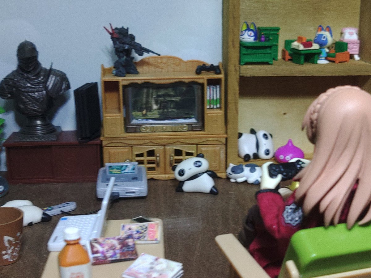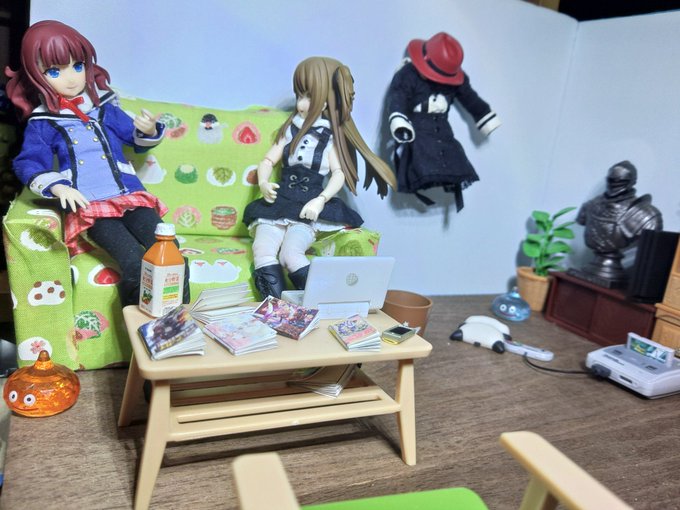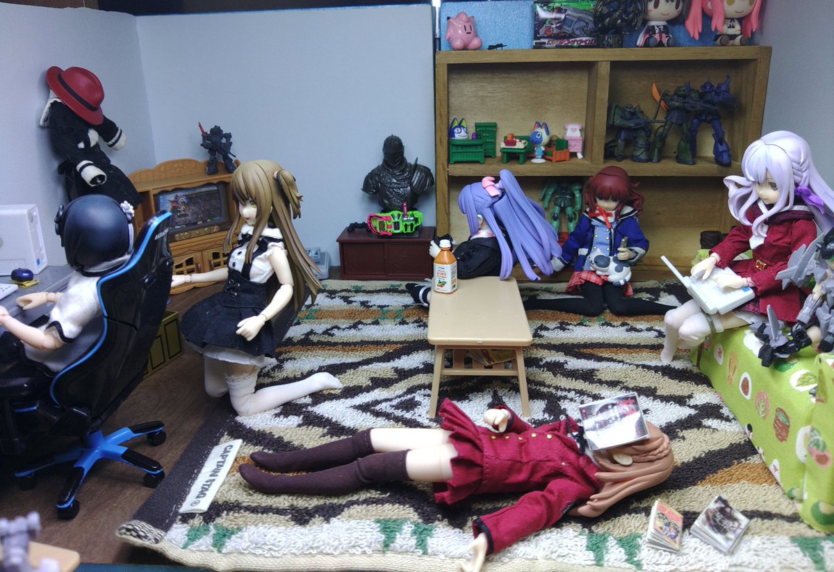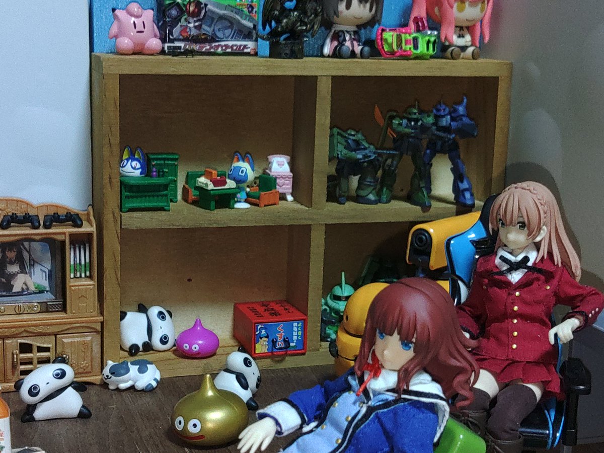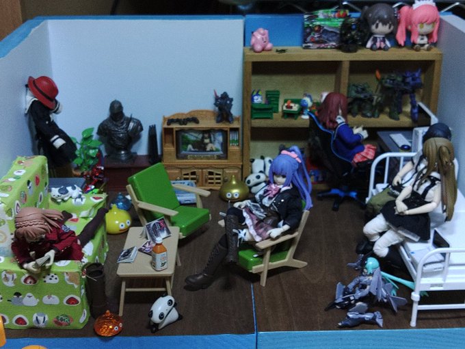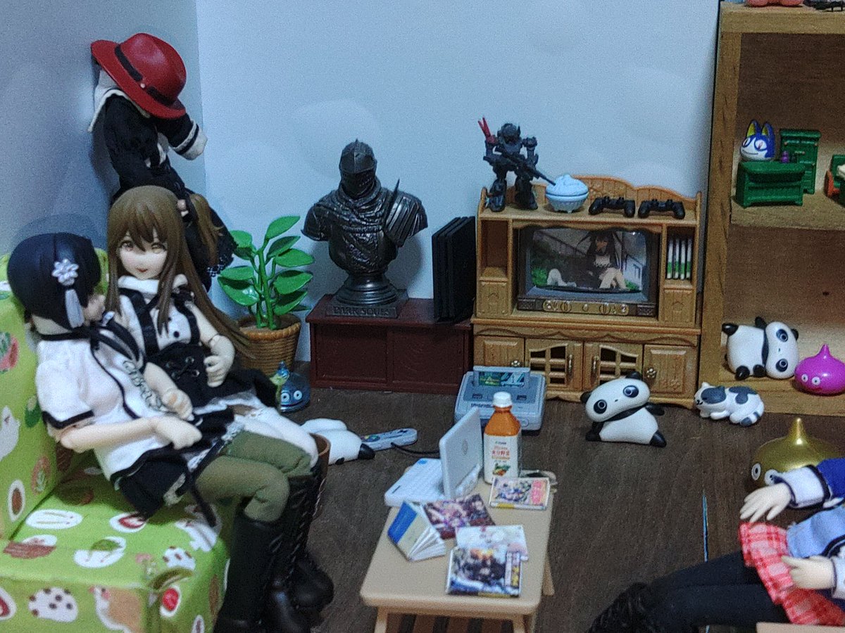 ドール用に作った部屋、ソファ前のテーブルには常に漫画が置かれており、テレビとゲームも備え付き、あとスライムとたれぱんだが生息している #アサルトリリィドール部