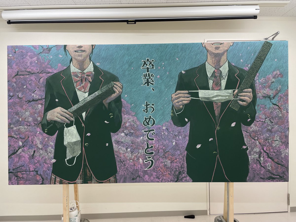 #今年も残りわずかなので今年一番伸びた絵を貼る見た絵描きさんも強制でやる ダントツでこの黒板アートやったで。ポケモンの増田さんがRTしてくれたおかげで、色んな方に認知してもらえた一枚になりました!卒業生のみんな元気にしてるかなあ。