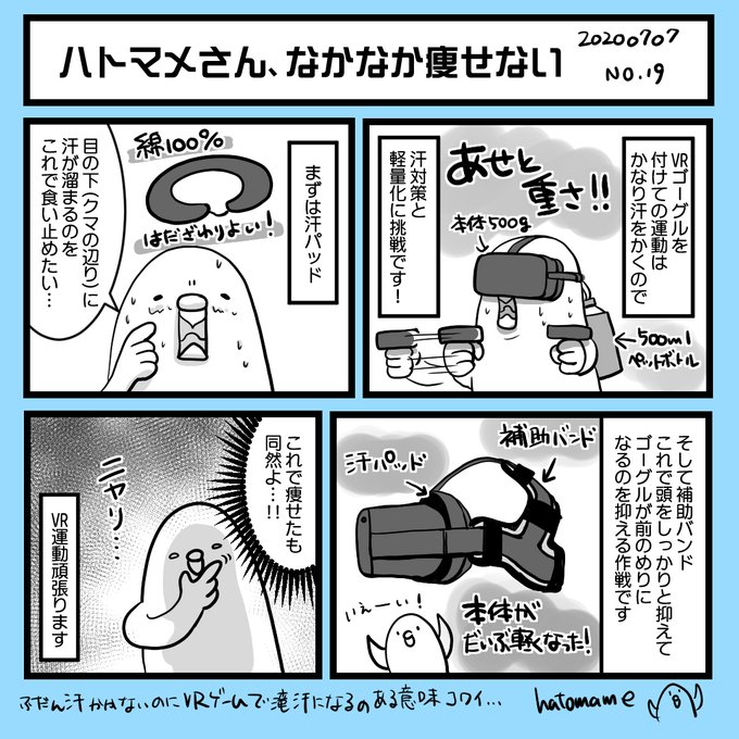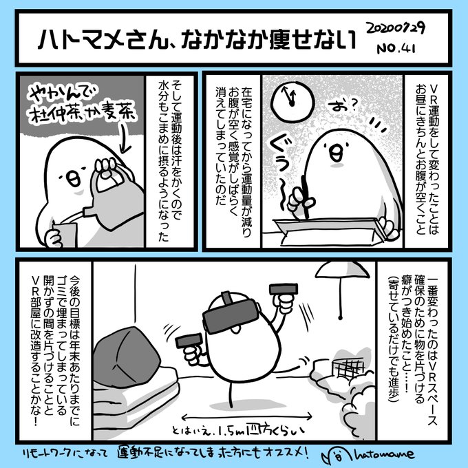 9 14 持ち運びの出来るケーブル無しのOculusQuest、VRに集中できる1人の空間&時間が取れそうなら本当にオススメです(`・ω・´)ゞ 痩せるのもだけど部屋も片づけなきゃ…(n回目 #ハト痩せ #エッセイ漫画 #VR運動 20/07/29 22:10