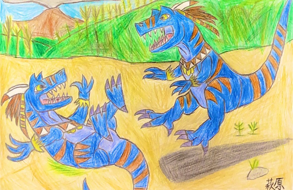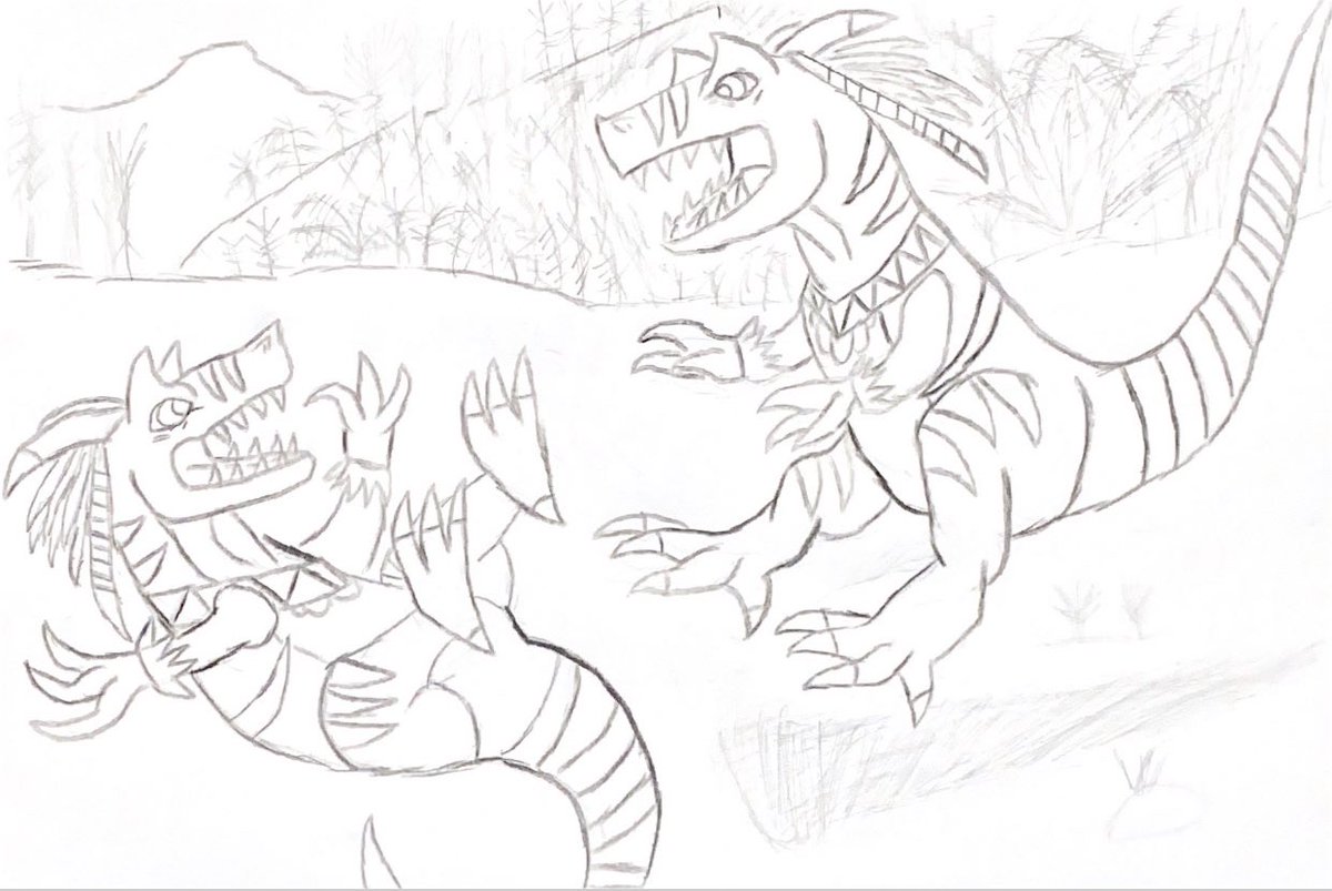 #デジモン #Digimon #イラスト好きさんと繋がりたい 今、僕が描いている アロモンのイラストの途中経過です‼️↓ 少し見づらいのですが、 飛びかかっている方の アロモンの影を描いたり、 背景の植物や火山も描きました‼️😄 今週中に完成させる予定です‼️😆 (あとこの絵の題名も考えなくては...。🤔)