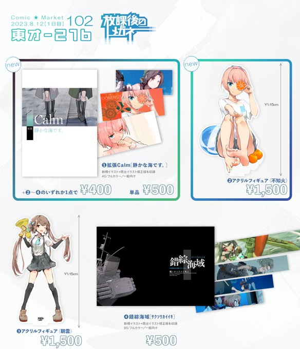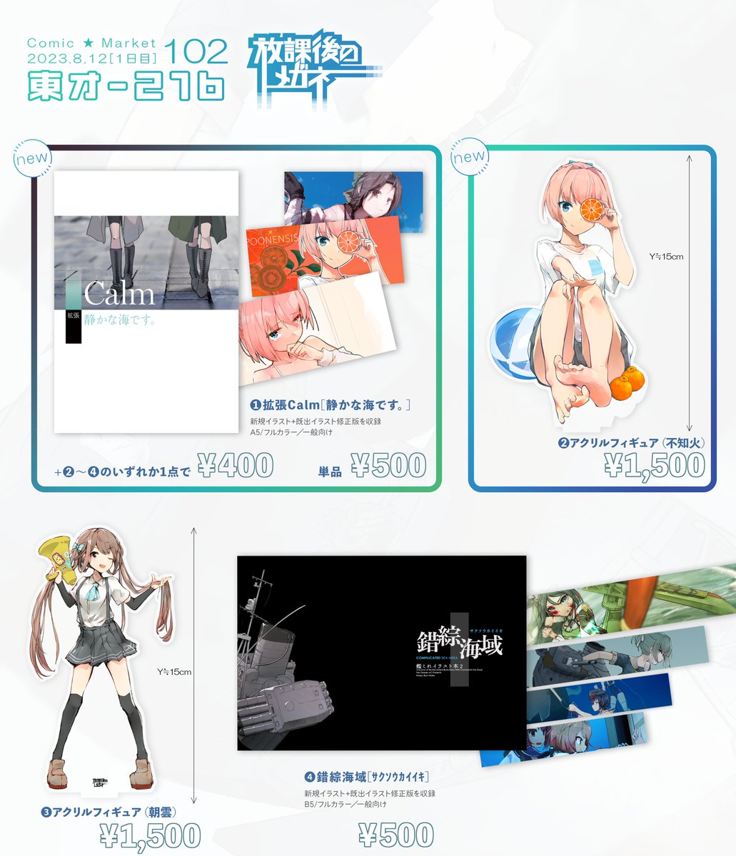 C102夏コミお品書きです!✨✨ 今回の新刊も不知火の成分がちょっと多めですが、色んな艦娘のイラストを収録しています。 不知火アクスタはちょっと大きめでサイズ感とても良い... 8月12日(土)1日目東オ-21bでお待ちしています! 暑さ日照り対策しっかりしてお越しください… twitter.com/i/web/status/1…