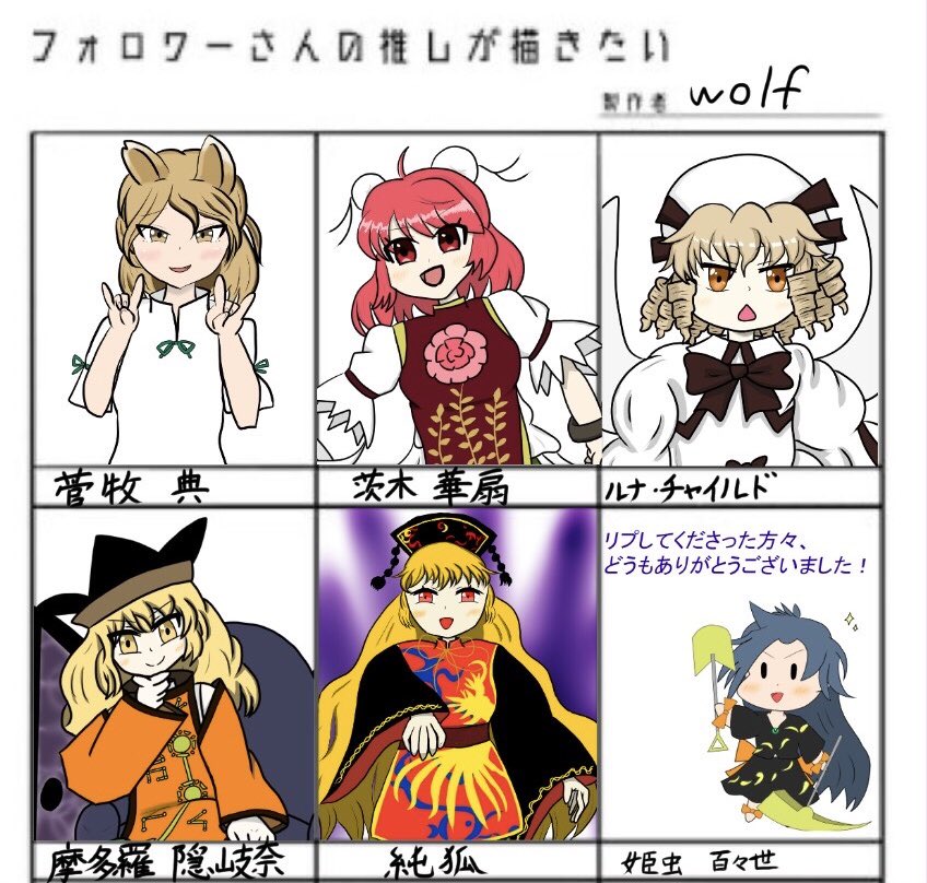 大変お待たせしました…リクエストのあったキャラ5人(と友情出演枠の百々世)完成しました〜。 次回は10月〜11月になります、お楽しみに! リプ下さった方々↓ @erinn1117 @namamono32768 @umaru4869 @sod617 @noa23110 #フォロワーさんの推しが描きたい