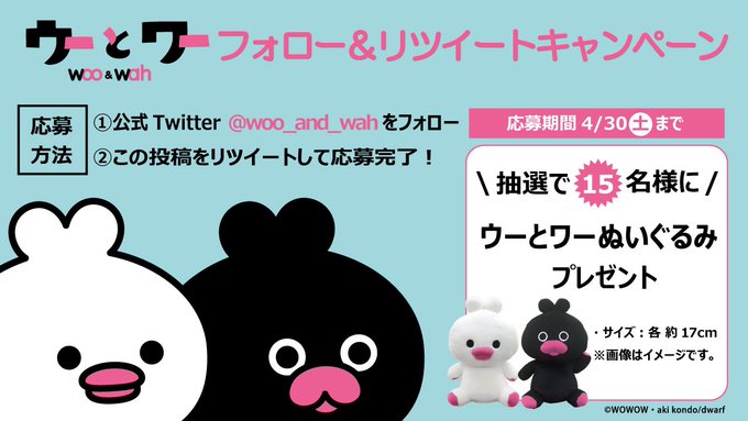 ⚪️ウーとワープレゼント企画⚫️ \フォロー& RT キャンペーン/ 抽選で15名様に『ウーとワー』 ぬいぐるみ&カプセルガチャ (ランダム1つ)をプレゼント🎁 📌応募方法 1️⃣@woo_and_wah をフォロー 2️⃣この投稿をリツイート ※利用規約を必ずご確認ください #ウーとワー #WOWOW #リツイート