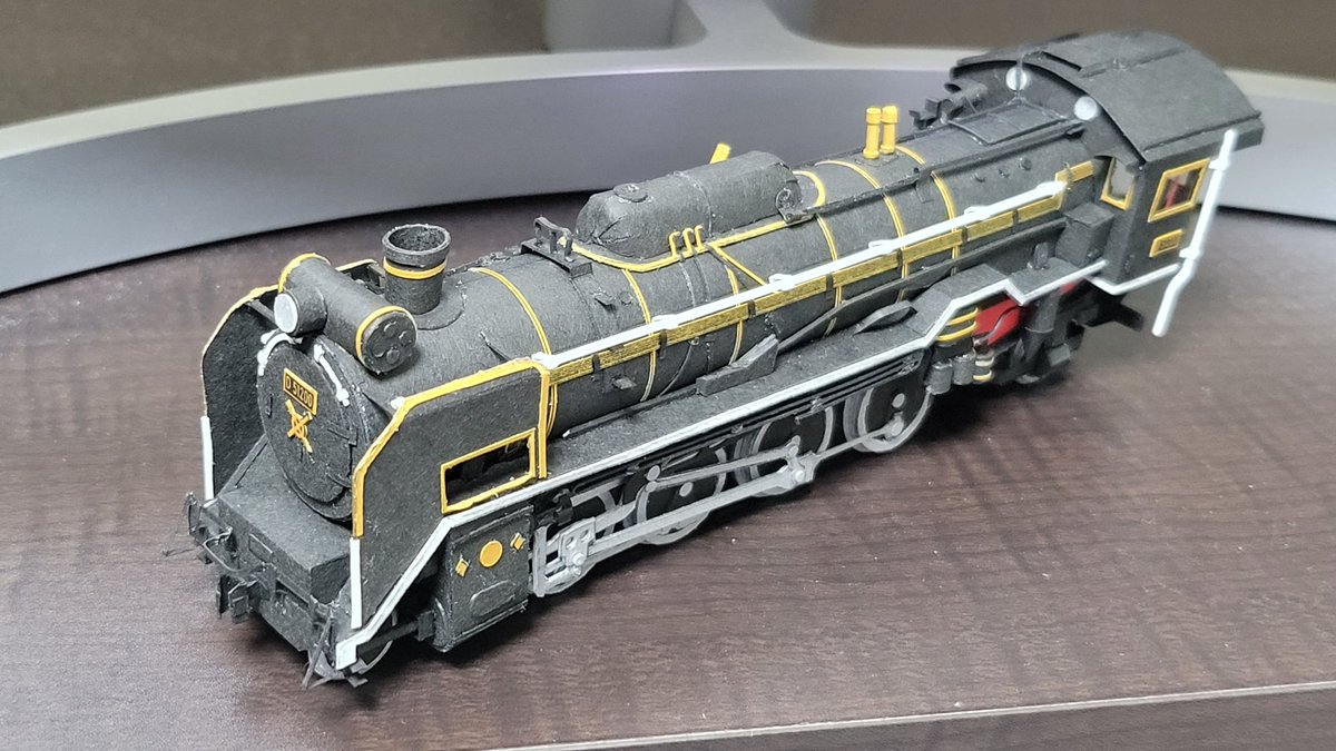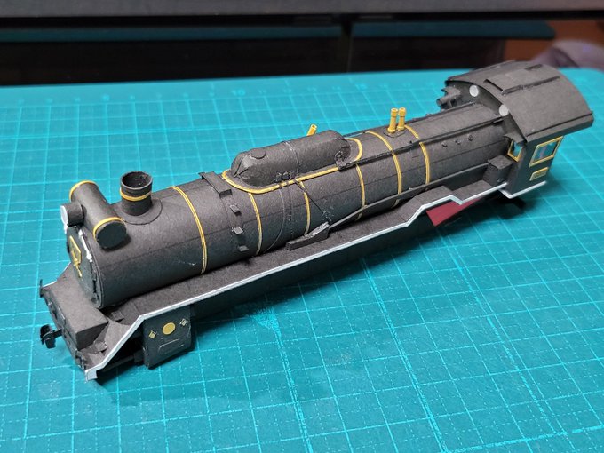 D51製造中、その5 細かい部品をさらに追加。大分ソレっぽくなってきた。 デフ板をまだ付けてない。 こっから難しいランボード下部の製作。 ちなみにD51200を参考にしてるけど、割といいかげんに作ってる。「違うやん!」とか言っちゃいけない。カッコよければいいのだ! #ペーパークラフト