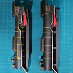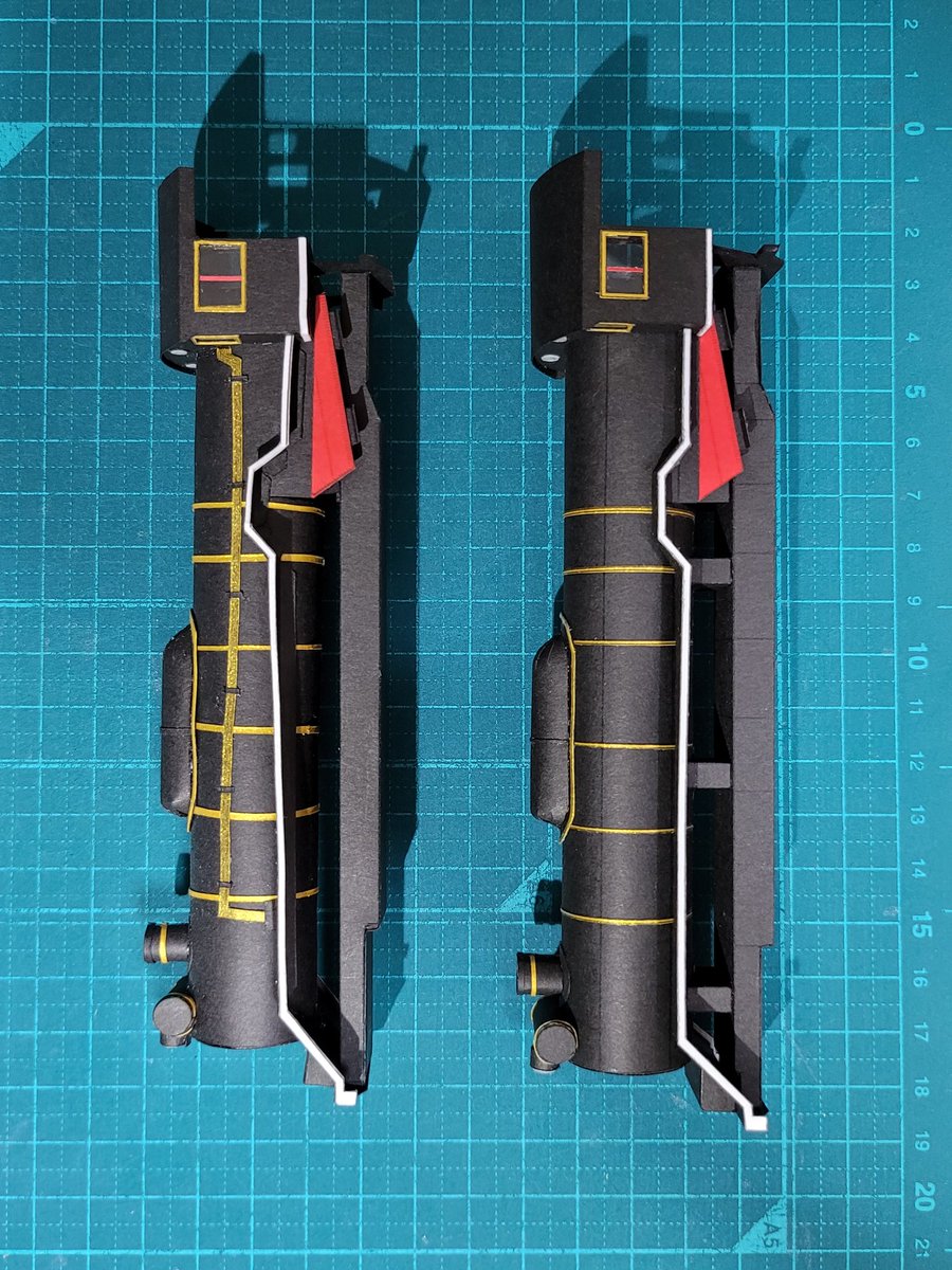 1 24 D51製造中、その3 一回目が酷すぎるので作り直した。上が一回目で下が作り直し。 ガイドライン引いたのとボイラー支えを新造したおかげで大分歪みはなくなった。(まだ歪んでるけど…) とりあえずこれで製作を進めてみる。今度は手を抜かないで行こう… #ペーパークラフト 21/11/14 00:55