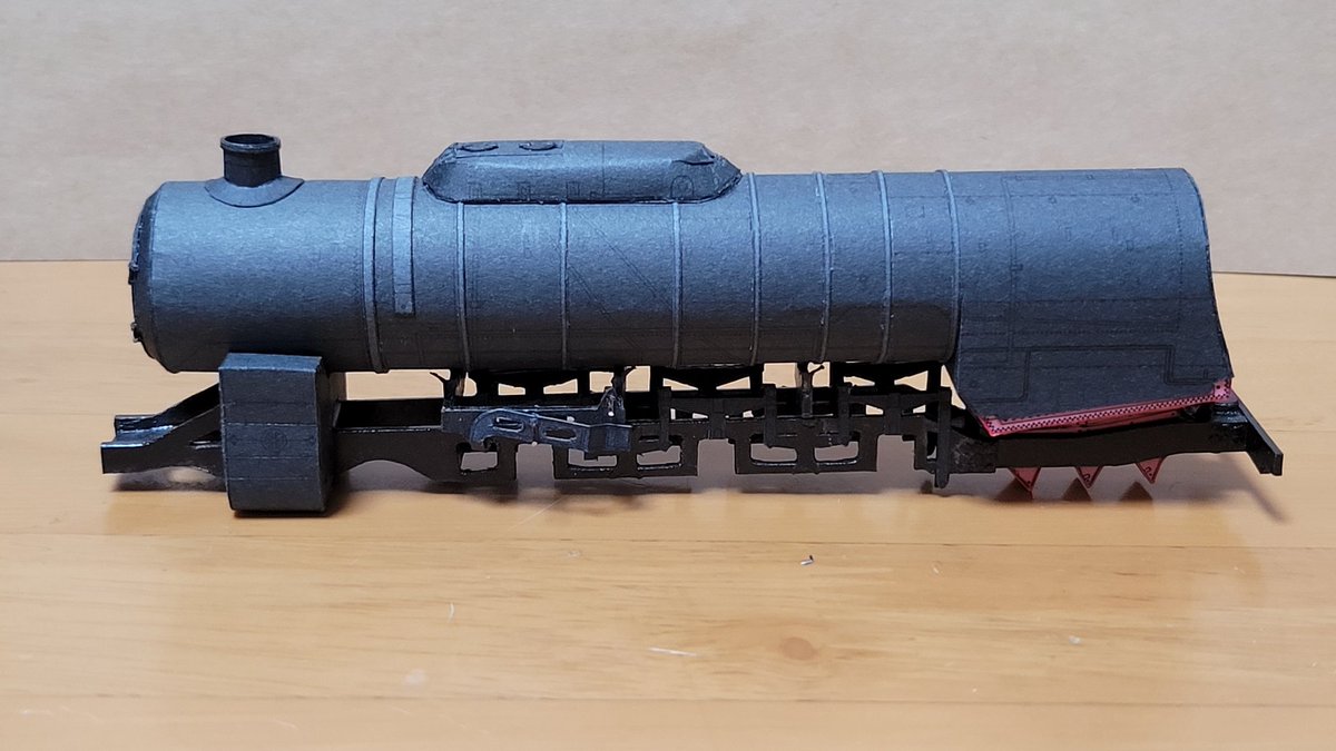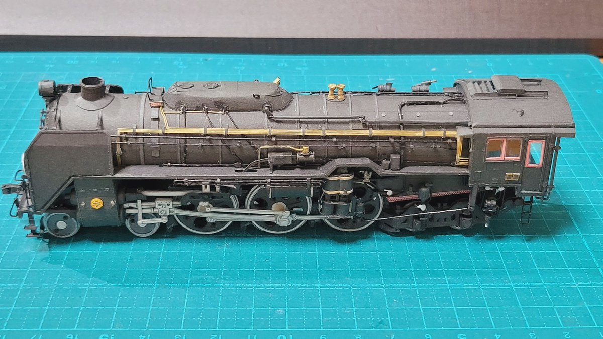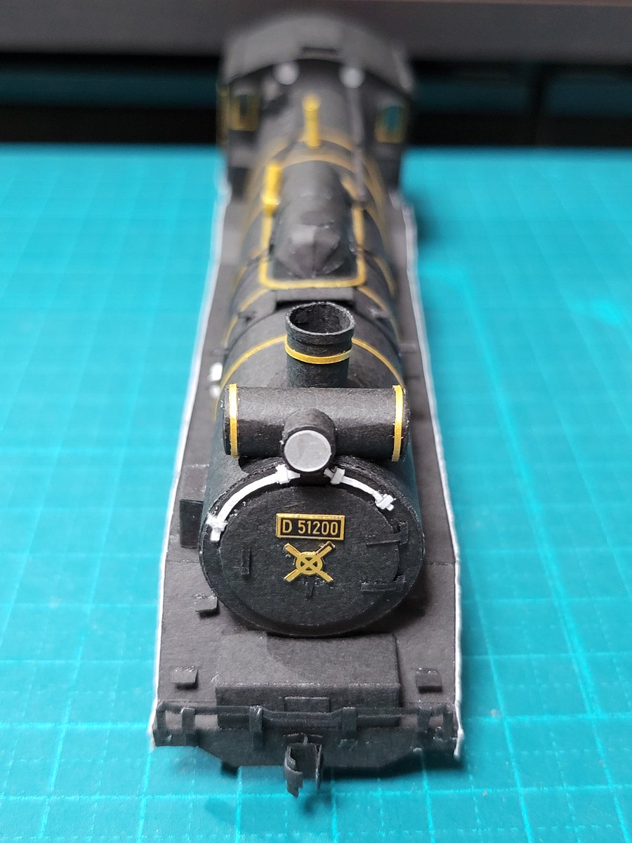 D51製造中、その10 テンダーほぼ完了。あとは細かい配管やホースを付ければ完成。 機関車の運転室下部を写真見ながらソレっぽく構築。左はこれでいいかな… 右側はこれから。 連結してみるとやっとD51の勇姿が見える。もうちょっとで完成…のハズ。 #ペーパークラフト
