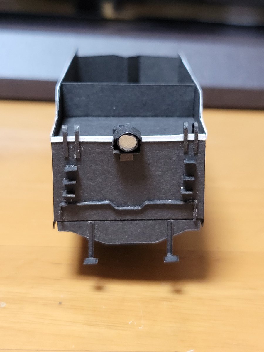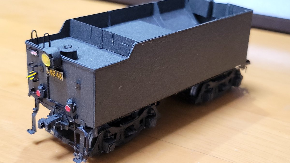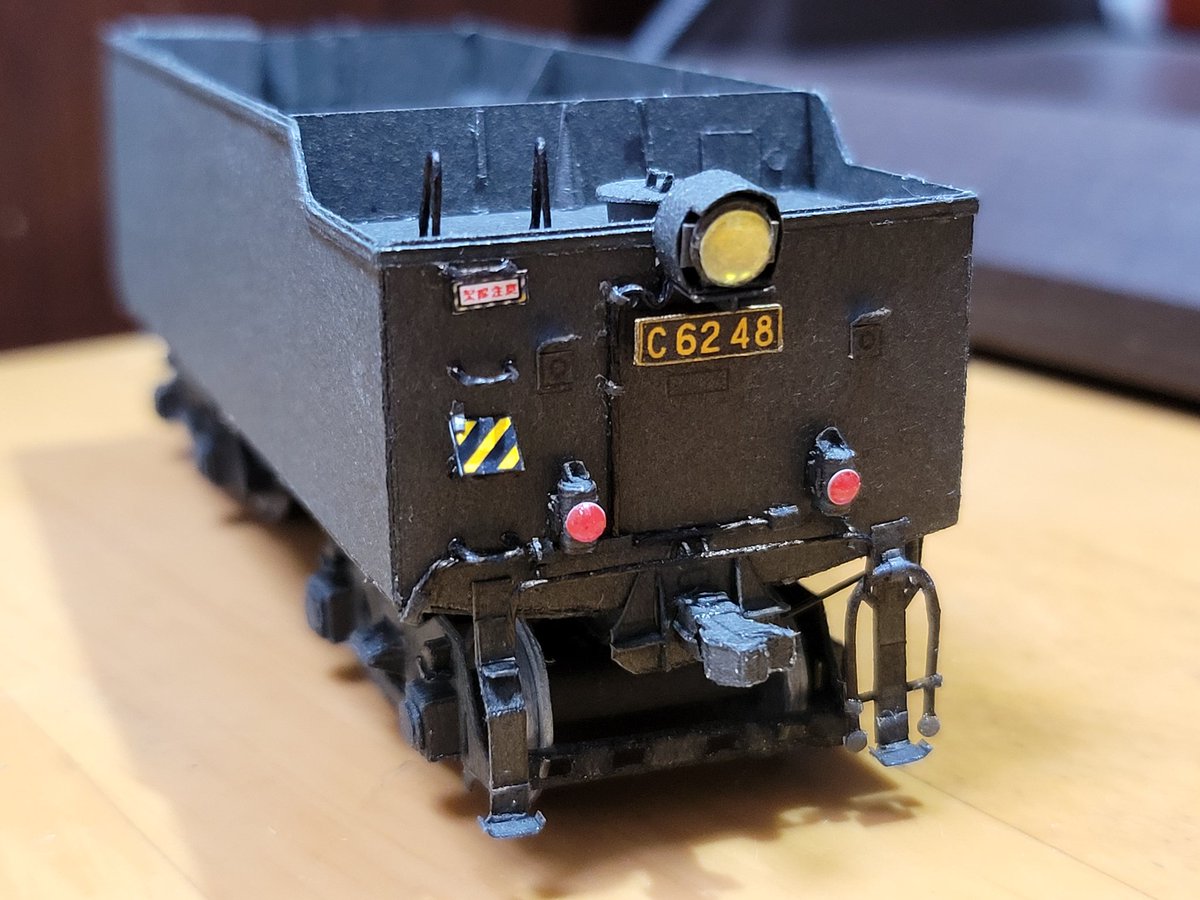 C62製造中、その29 炭水車の背面、底面を作成。 背面のランプはレジンで作成。結構いい感じ。 底面のブレーキシリンダは配線がイマイチ。実機ぽく銅線で配線してみたけどなんか変。色が浮いてる… 炭水車自体はこれで完成。あとは機関車との連結を調整すれば完成かな。 モウチョット #ペーパークラフト