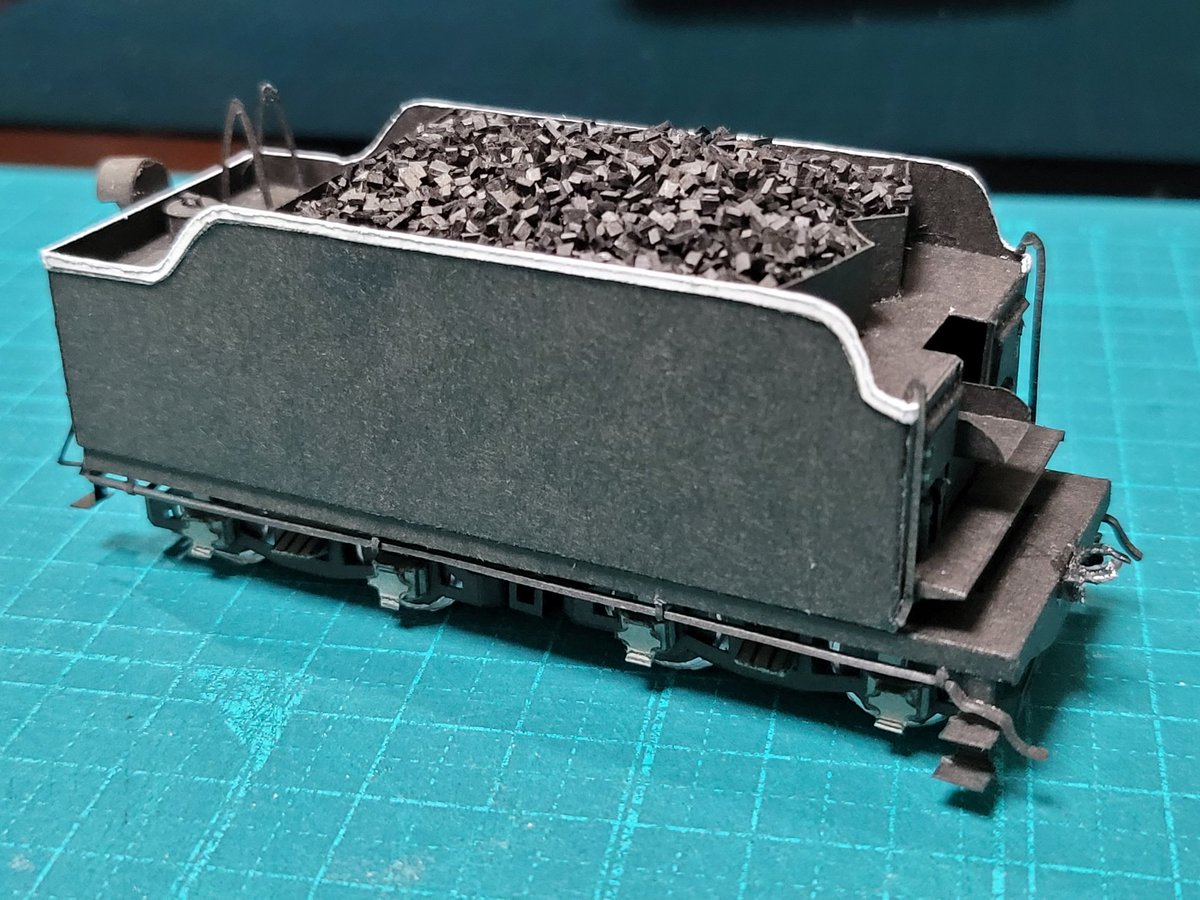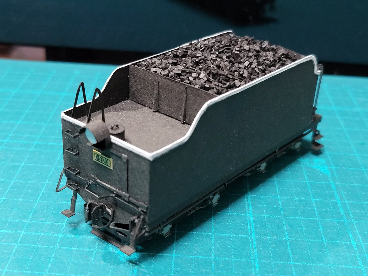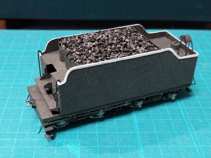 D51製造中、その13 炭水車完成。細かい配管や暖房管ぽいものを追加。 あと頑張って石炭ぽいものも作ってみた。(紙3枚貼り合わせて1mm角に切り出す) これ以上はいいかな…次回で完成。 #ペーパークラフト