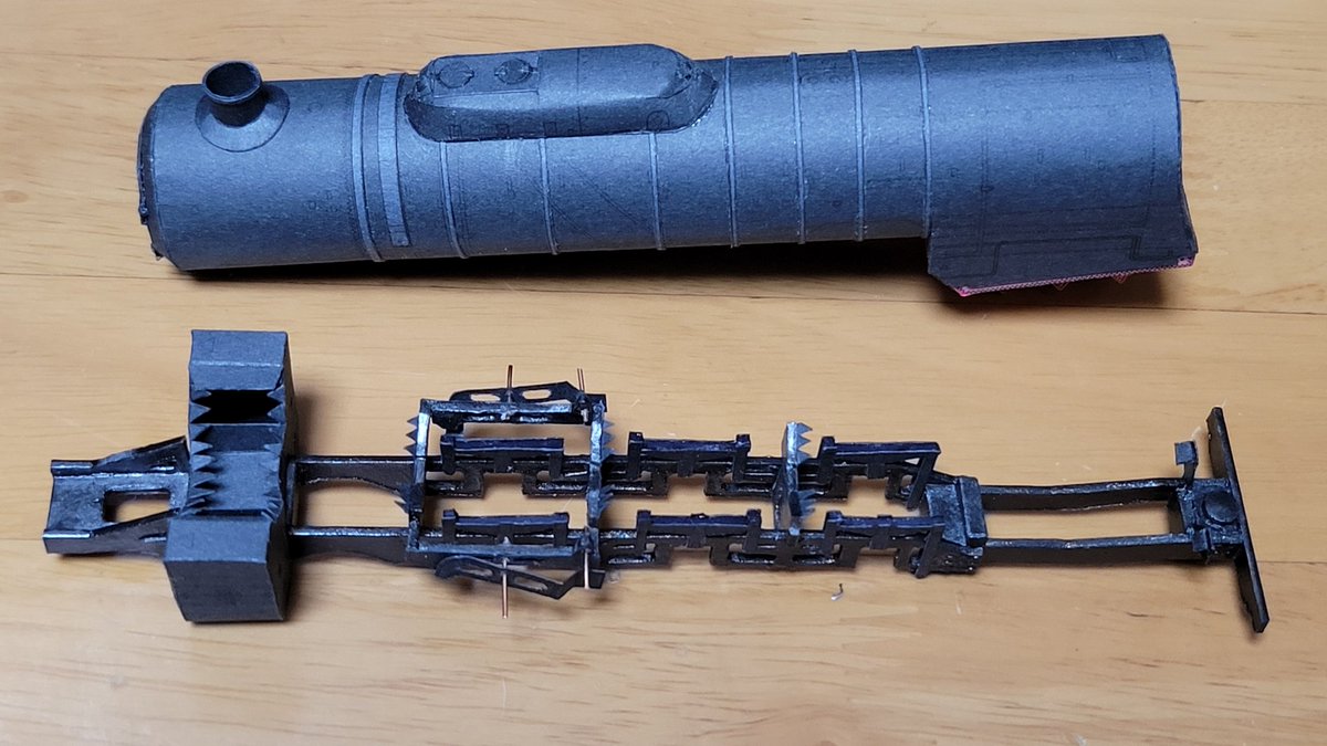 C62製造中、その6 一日で凄い進むw 台枠を塗装してイコライザーとかモーションプレートを作成。 塗装色の黒鉄色がいい感じ。ムラが鉄っぽくていいw モーションプレートはまだ未完。先に動輪かな。 試しに組み合わせたら結構SLぽくてちょっと嬉しくなるw #ペーパークラフト