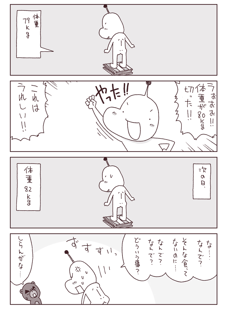 体重の不思議。 大して変わらない日常を過ごしているのに、 数キロ変化してる・・・ なんでやねん。 #絵日記