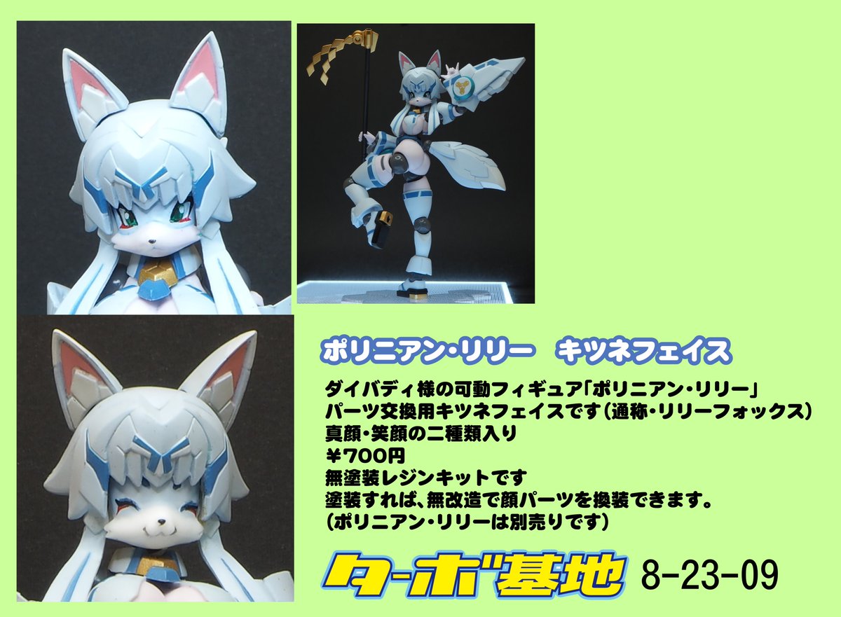 当日版権モノ ダイバディさんのポリニアン・リリーのボディを使ったキツネフェイスです(通称・リリーフォックス) 真顔・笑顔の二種類入り ¥700円 無塗装レジンキットです 塗装すれば、無改造で顔パーツを換装できます。 (ポリニアン・リリーは別売りです) #WF2023S #ワンフェス2023夏