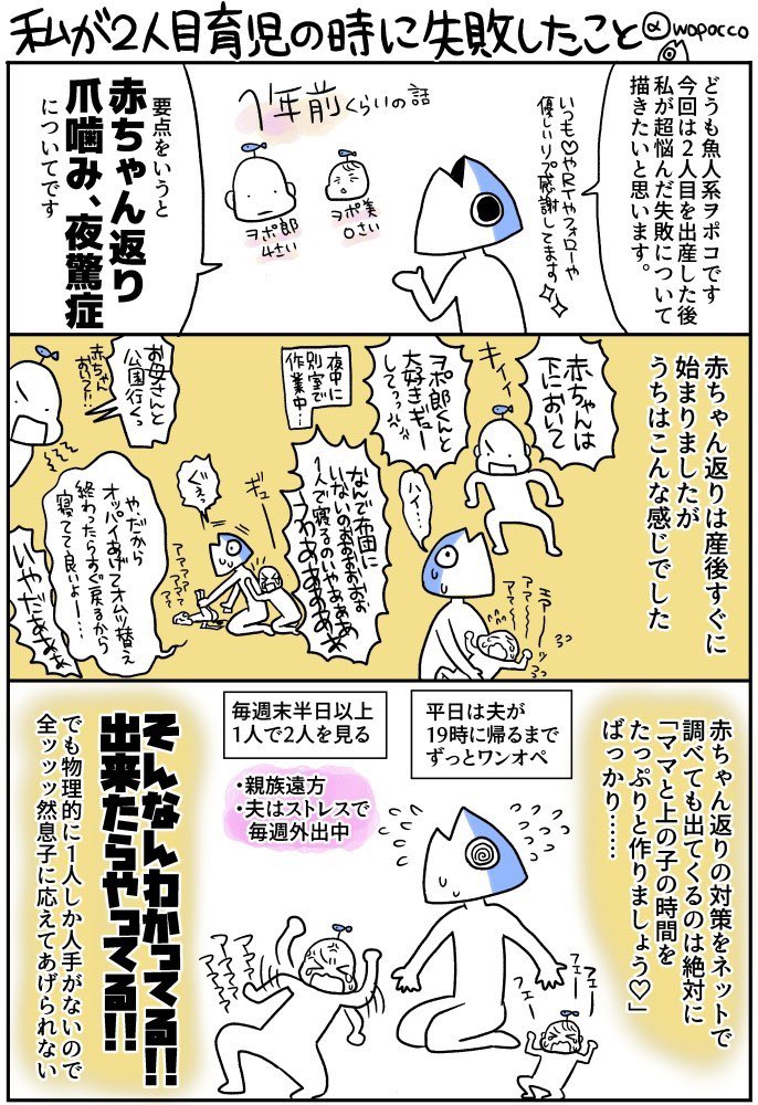 先程RTした記事で出ていたどもり(吃音)、上の子は下の子が生まれてから爪噛みと共に出現してとても悩んだマンガを以前描きましたので再掲します 続きはブログのここで読めます wopocco.com/akatyangaeri_t… 少しでも誰かの心を軽く出来たらいいなと思って描きましたので、良かったら読んでやって下さい