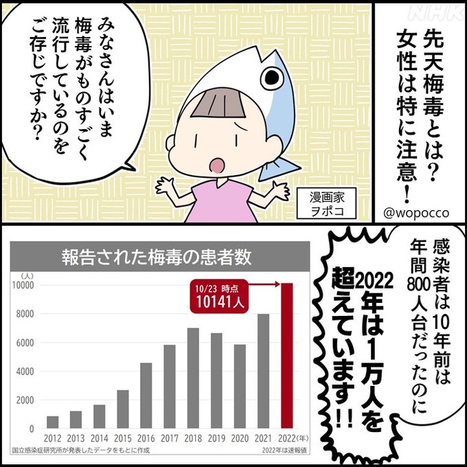 現在梅毒という性病がはやっているので漫画を描かせて頂きました 10年前…年間800人台 2022年…年間10000人台(10/23時点) 女性だけで見ると今までは100人台 今は年間4000人も感染しているという話も伺いました nhk.or.jp/shutoken/wr/20… 特に妊娠中にかかると?という視点で問題点をお聞きしました