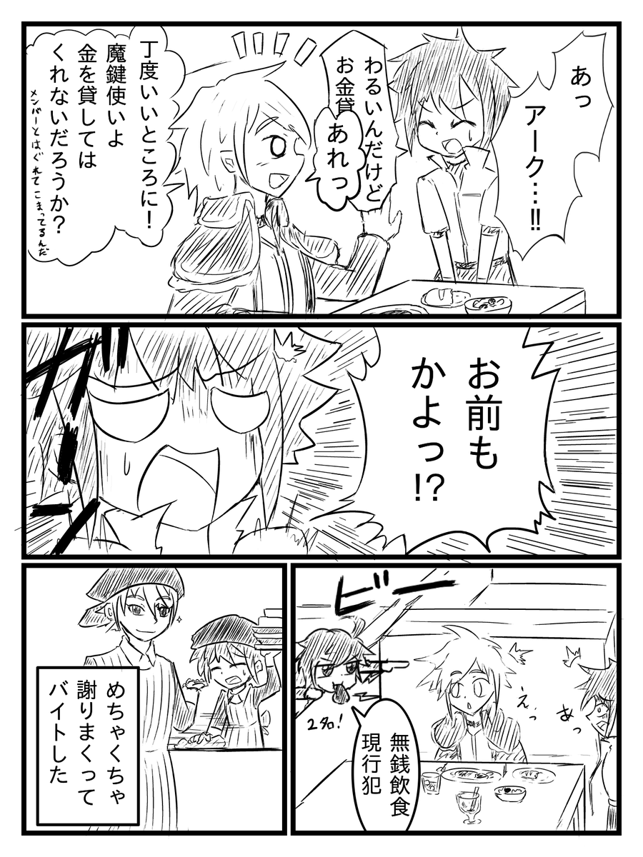 シュウジ(@cork1000)さんと「アーク様とマスター君が出てくる」というルールでのネーム交換にて描かせていただきました~!シュウジさんの方も見てみてね~!!!