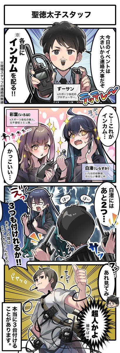 『配信の裏側』 配信の裏ではスタッフが大騒ぎ。 配信に声が入ってしまうので普通はNGですが、ウェルプレイドリーグではOKとしていますw #いろはアート #4コマ漫画 #毎回演者さんに声聞こえてるって言われる