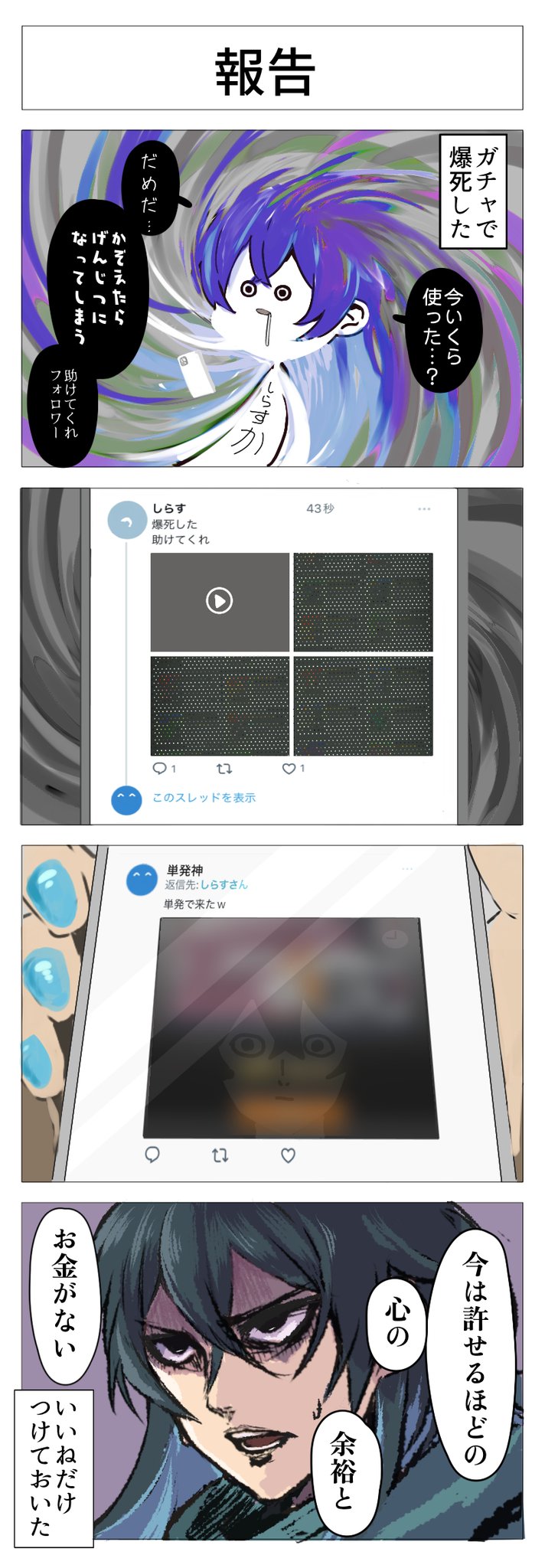【#4コマ漫画 】 「ガチャで爆死した時にいけしゃあしゃあと現れるサイコパスなんなの?」 絵:れんたろう(@mechacoquelico ) ■他の作品は公式HPで wpl-colorless.com
