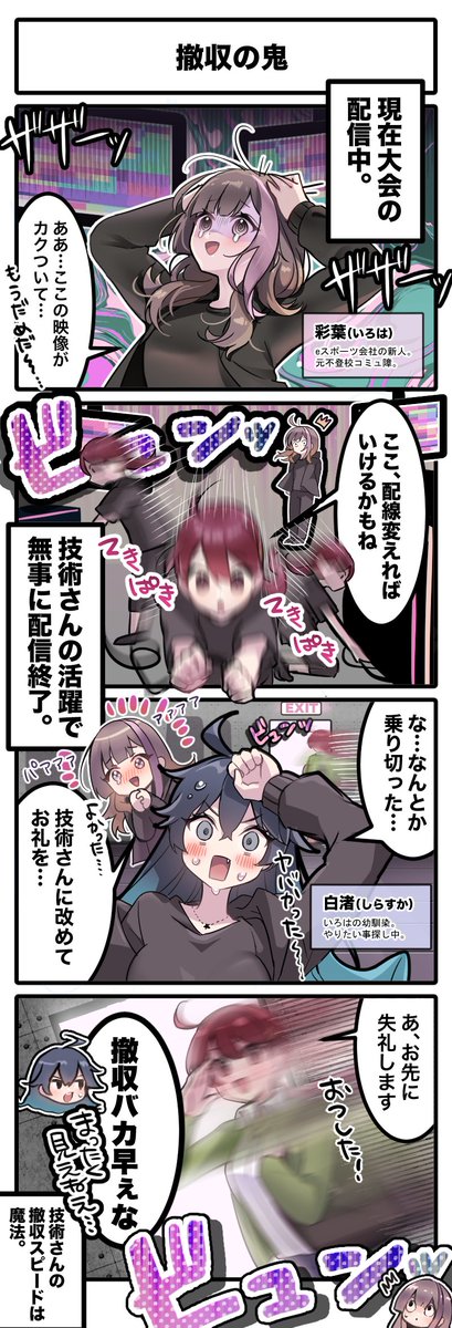 【#4コマ漫画 】 eスポーツに限らず、イベントや配信の技術さんは撤収作業の速さが尋常じゃない。 絵:みやこん部長(@konbu_now ) ■他の作品は公式HPで wpl-colorless.com #漫画が読めるハッシュタグ