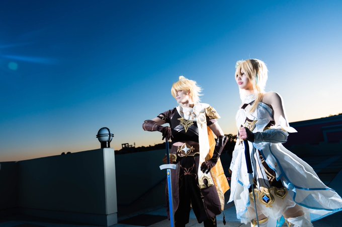 ⚠️コスプレ/Cosplay 原神/ 空:れんち。 蛍:卯月ディア(@Diamant_cos ) ラグコスのお気に入り写真を再掲✨ 夕暮れ時の、建物屋上にて。 Photo:ゲンジイさん(@gargoil20061 ) #ラグコスチャレンジ #ラグコス
