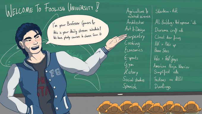 Yesterdays' stream bit got me inspired so...🍃 "Welcome to your 1st day at Foolish G. University! Where you may or may not learn something :D" [#イラスト #foolishgamersfanart #foolishfanart ]