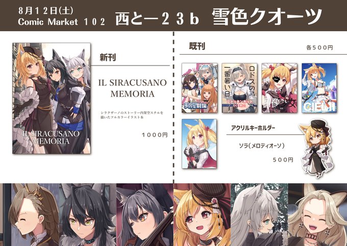 #C102お品書き #C102 夏コミお品書きです!新刊はシラクザーノ激推しイラスト本です!! 1日目西と23bですよろしくお願いします~~!!! (1/3)