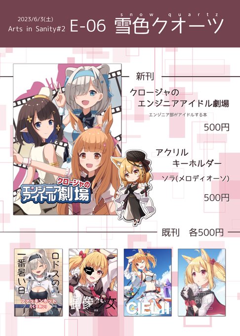 22 26 【お品書き】 6/3のAiS2お品書きです 新刊とアクキーと既刊があります。 ソラの既刊とアクキーは持ち込み数少なめなのでご注意を。 よろしくお願いします~! #AIS_02 23/05/27 20:56