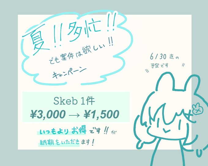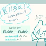 【宣伝】 Skebを現在¥3,000→から¥1,500からお受けしております! 案件が!!とても!!!欲しいです!!! しかし同時に夏季が多忙でして、納期をいただいています。 ゆったり納期だけれどお安く、でよろしければぜひ気軽に宜しくお願いいたします!! skeb.jp/@wsrn66