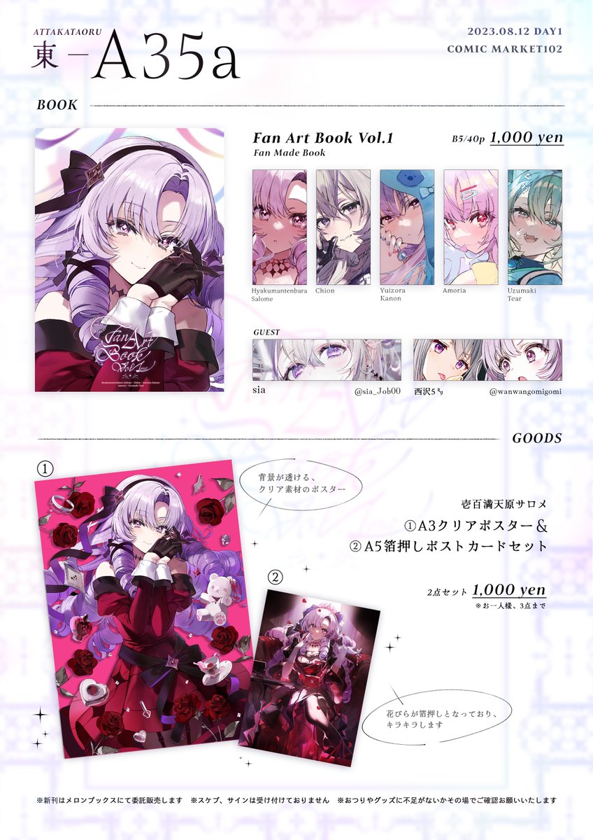 #C102 お品書きと新刊の通販開始のお知らせ 夏コミ新刊「fan art book vol.1」とA3クリアポスター+A5箔押しポストカードセットを頒布予定です! 新刊の通販予約はこちらから 🍈melonbooks.co.jp/detail/detail.…