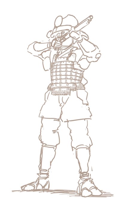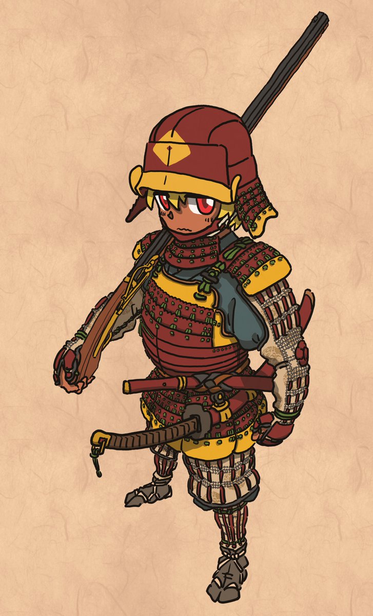 腹当つけた鉄砲ちゃんrkgk 毛引威にしようかと思ったけど、桃形兜には素掛威のほうが似合うな