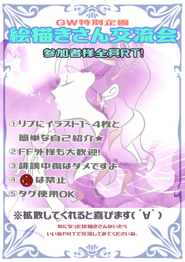 GWだしなんかしたい!ので 絵描きさん交流会開催します🌷 期間:5/29(土)~5/7(日) 参加者様は全員RT 気になる絵描きさんを見つけたら どんどん交流してみてください🎈 みんなで楽しい企画にしていけたらと思います☺️ #絵描きさん交流会 #イラスト #絵描きさんと繫がりたい