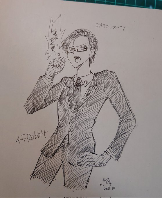 のろのろ進行でやっています… day2.スーツ 「細身のスーツに髪型は七三‼️ルックスに騙されてナメてかかると悲惨‼️🐰🚬」 ヒョォ!イルマティック入間銃兎!! 細身のスーツだけど警察官だからちょっとガタイいいの良… 画材 ハイテック0.4ミリ #inktober #inktober2021
