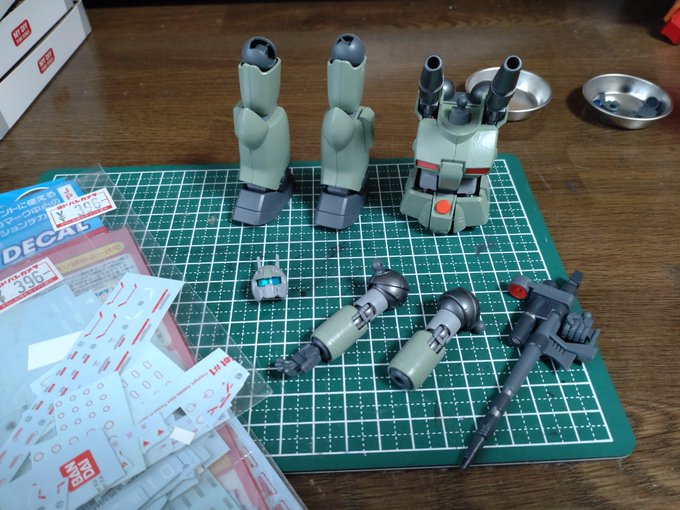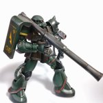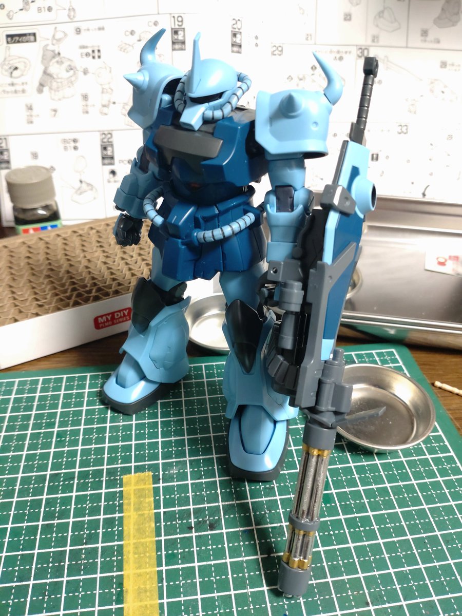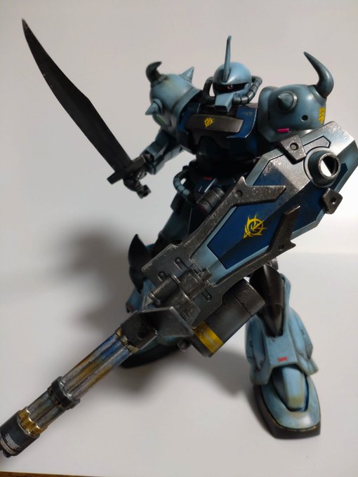 HGUCグフカスタム完成!肩に蛍光プラチップ貼ってバトオペ風にしてます。ガトリング砲の焼け表現がお気に入りです。 #ガンプラ #ガンプラ好きと繋がりたい #ガンプラの画像貼るとRTされると聞いて