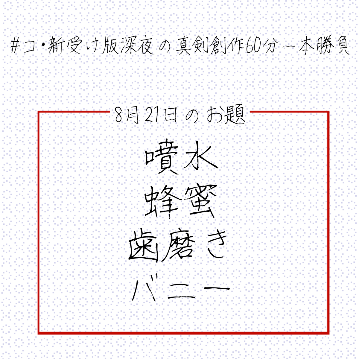 こんばんは 本日22時より、第21回コ・新受け版深夜の真剣創作60分一本勝負 を開催いたします。 本日のお題は画像をご確認ください。 注意事項を守って、ご参加をお待ちしております。 min.togetter.com/SxAESmg #コ・新受け版深夜の真剣創作60分一本勝負