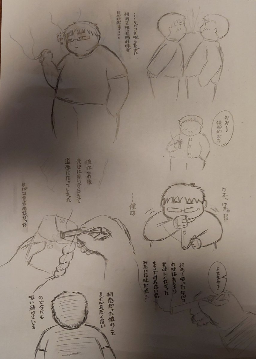 少し前に読んだ岩倉ゆうさんの漫画を少し参考にして、忘れないうちに下書きを描いてみました。(タバコは吸っていないです。想像して描いてみました。)いつもと違うけれど、新鮮さを感じて楽しかったです。下書きなので読みづらくてすみません