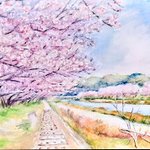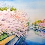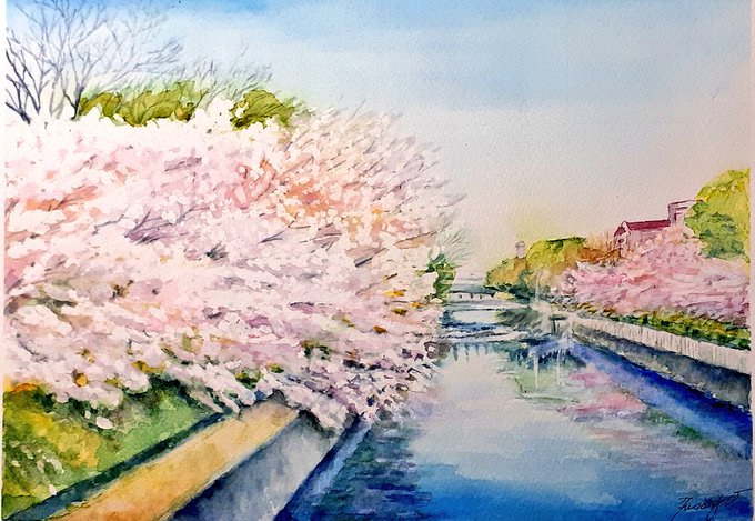 こんばんわ🌙😃❗ また 描いてたら 日を跨いで30日に成ってしまいました。 川になだれ込む 桜の枝を 描きました 道が 色濃いので 後で 薄くします。 濡れてるので 少しその部分は 色濃いいです。🥰 #水彩画透明水彩画 #アナログ #ランプライト #桜