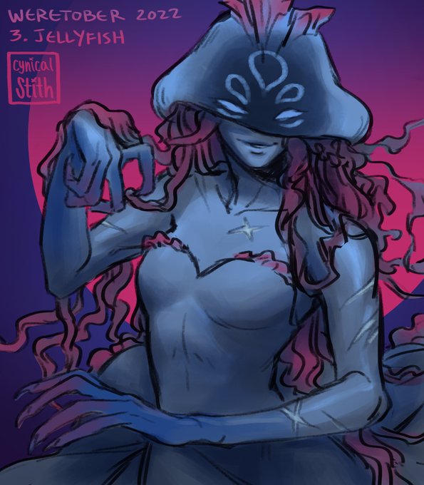 #weretober2022 day 3 - jellyfish! I started with a grotesque man o' war monster thing, but I ended up liking the spooky sea witch idea better