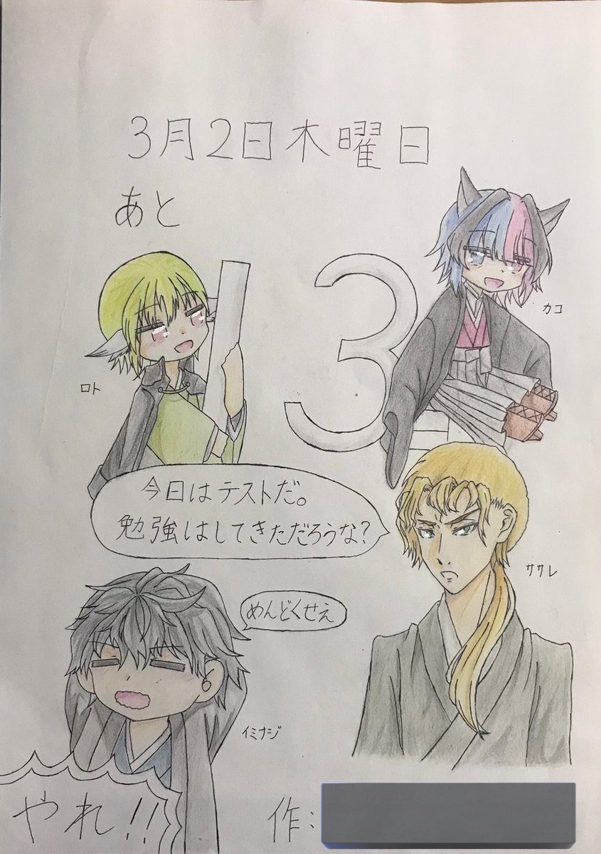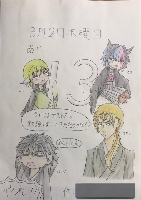 昨夜描いてた修了式までのカウントダウンカレンダーです! 普段1枚のイラストに数ヶ月かける私にしては数日で終わらせたのはすごいはず!笑 キャラクターは羽のオリ神様達です✨ #イラスト #月影ドローワールド