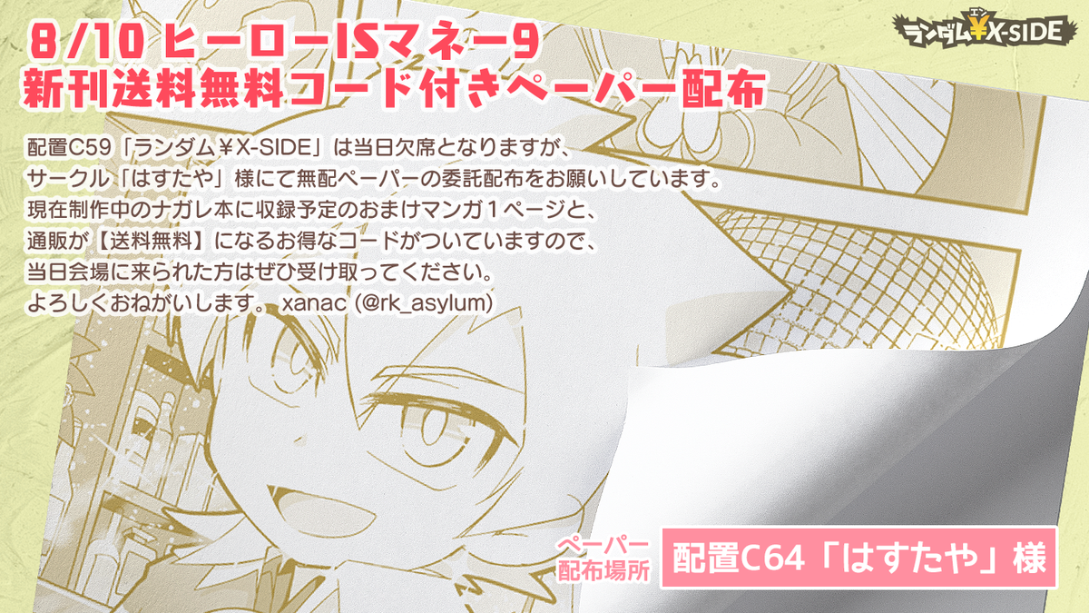8/10ヒーローisマネー9 ペーパー委託配布のお知らせ #pixiv #ヒーローバンク #天野ナガレ #秋内ハナ pixiv.net/artworks/83514…