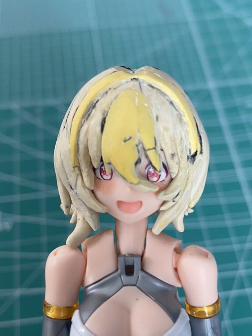 1 7 ①土台を作る ②髪をパーツかし少しずつ付ける ③やする 離型剤使うと作業しやすいけど、後から取れたりするので、パテが固まったら瞬着で固定するの必須です。 #メガミデバイス #おいでよエポパテ村 23/06/30 18:50
