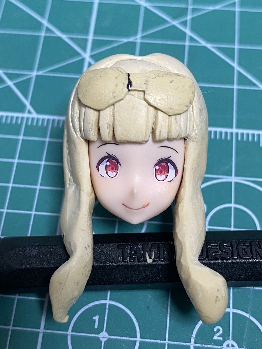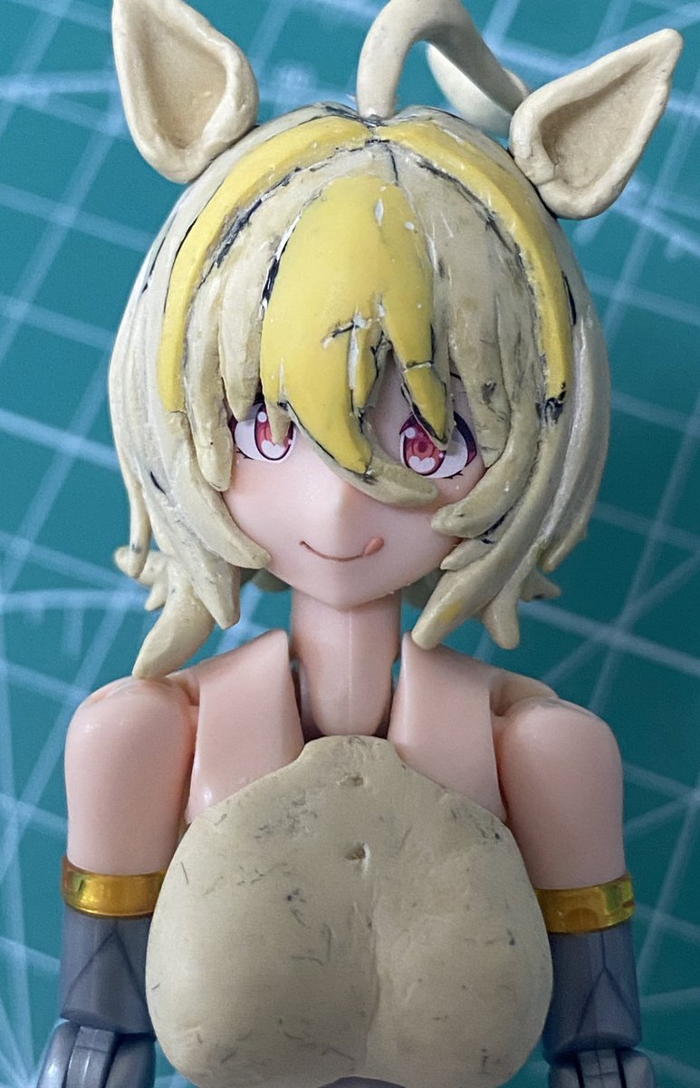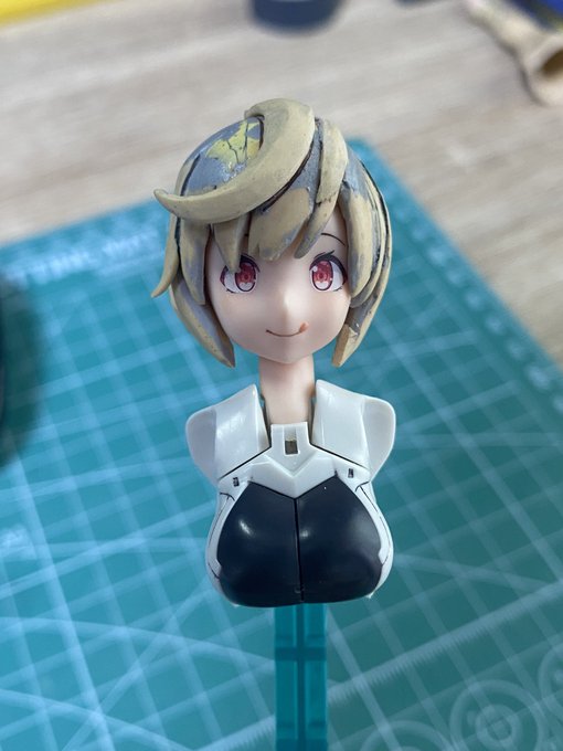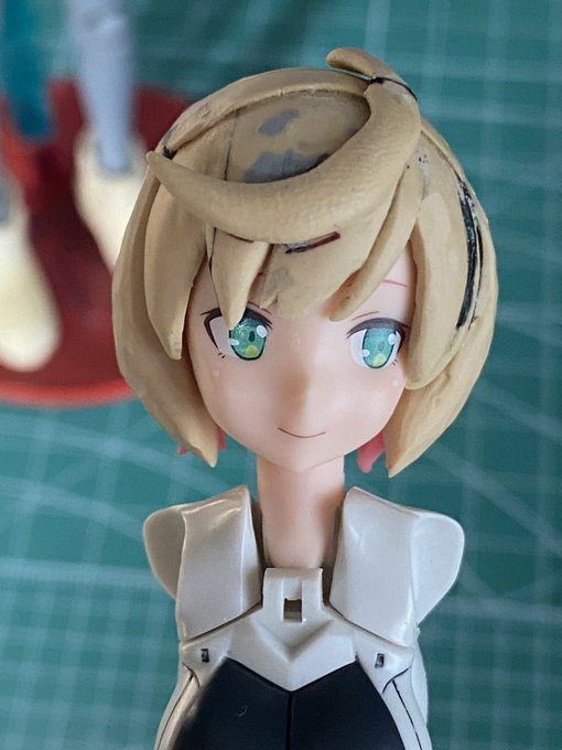 ①土台を作る ②髪をパーツかし少しずつ付ける ③やする 離型剤使うと作業しやすいけど、後から取れたりするので、パテが固まったら瞬着で固定するの必須です。 #メガミデバイス #おいでよエポパテ村
