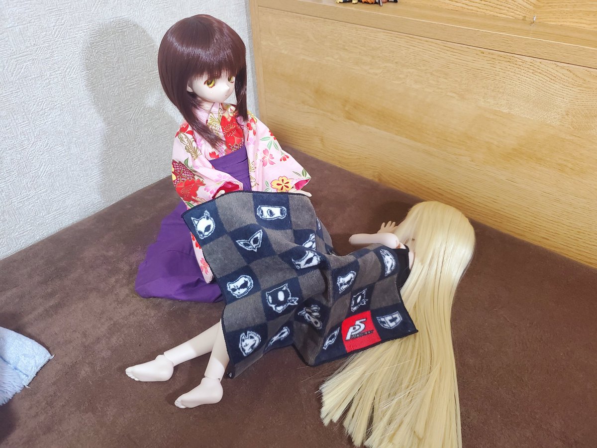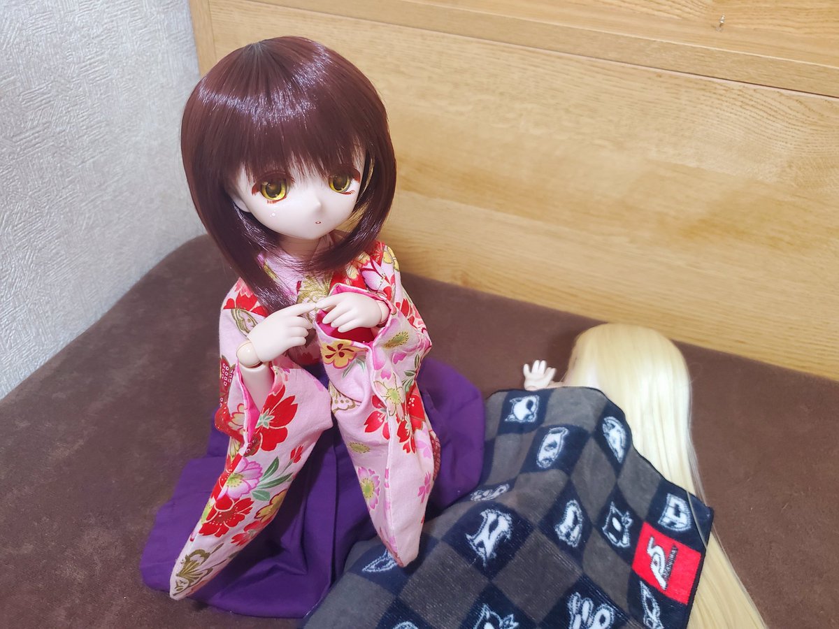 不定期ドール日記 No.93 題「侵略者」 柚「狂太朗さん、エフェメラちゃんが寝てしまったので何かかけてあげる物はありますか?」 狂「ハンカチでいっか。ところで俺はどこで寝れば?」 柚「あ、ごめんなさい。何も考えていませんでした…」 狂「いいよいいよ」 #うちのこかわいい #MDDはいいぞ