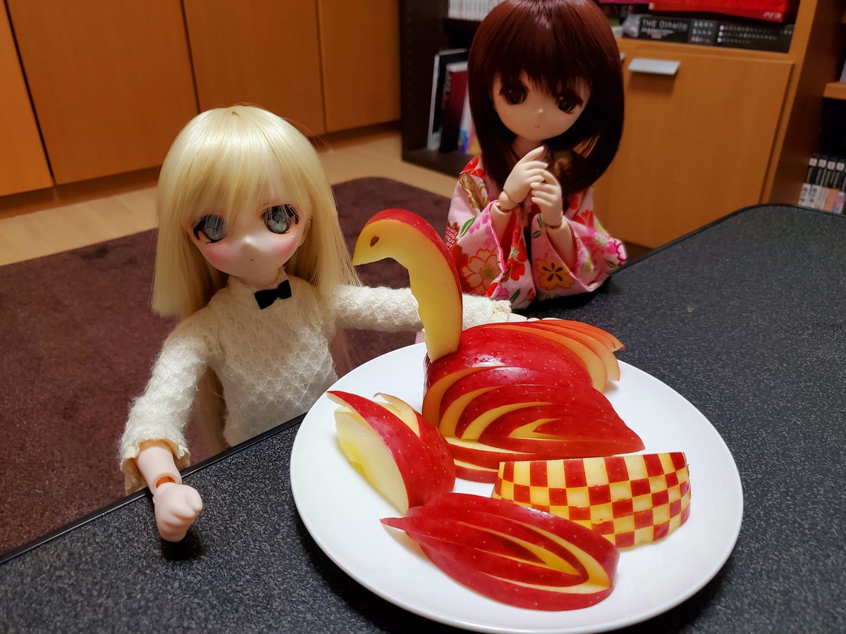 過去から バーテンダーはお酒やカクテルを提供するだけに非ず。果物の飾り切りもやったりします。なお、時間をかけすぎて「誰がここまでやれと」とおやつを待ちかねていた金髪にどつかれた模様。 #MDDはいいぞ #うちのこかわいい