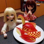 不定期ドール日記 No.101 題「たまには手抜き晩御飯」 柚「お疲れなんですね」 刹「なんか狂太朗のやつだけ大きくてずるくない?」 狂「ウォッカといい、身の丈を考えないやつだな…」 柚「ほらエフェメラちゃん、お芋もありますよ?」 刹「ポテトで買収されるとは甘いわよ柚子」 #MDDはいいぞ