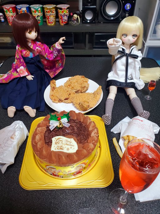 不定期ドール日記 No.120 題「れっつぱーりぃ」 クリスマスっぽい色のカクテルを作ってディナーです。メリークリスマス! 刹「なんでモスチキンなの?普通ケンタッキーでしょ?」 狂「近くにケンタッキーないんだよ」 柚「お肉はお肉ですよ?エフェメラちゃん」 #うちのこかわいい #MDDはいいぞ