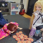 不定期ドール日記 No.94 題「おやつ大好き!」 ミニサイズの駄菓子を見つけるとついつい買ってしまうドールオーナーの性。皆様もご経験は? 刹「柚子。大きなドーナツを見つけたわ。こっちにしない?」 柚「そっちは狂太朗さんが食べるやつでは…?」 #MDDはいいぞ #うちのこかわいい